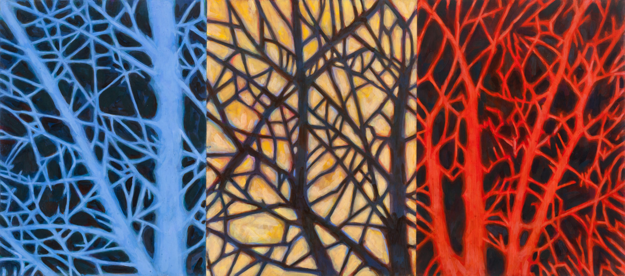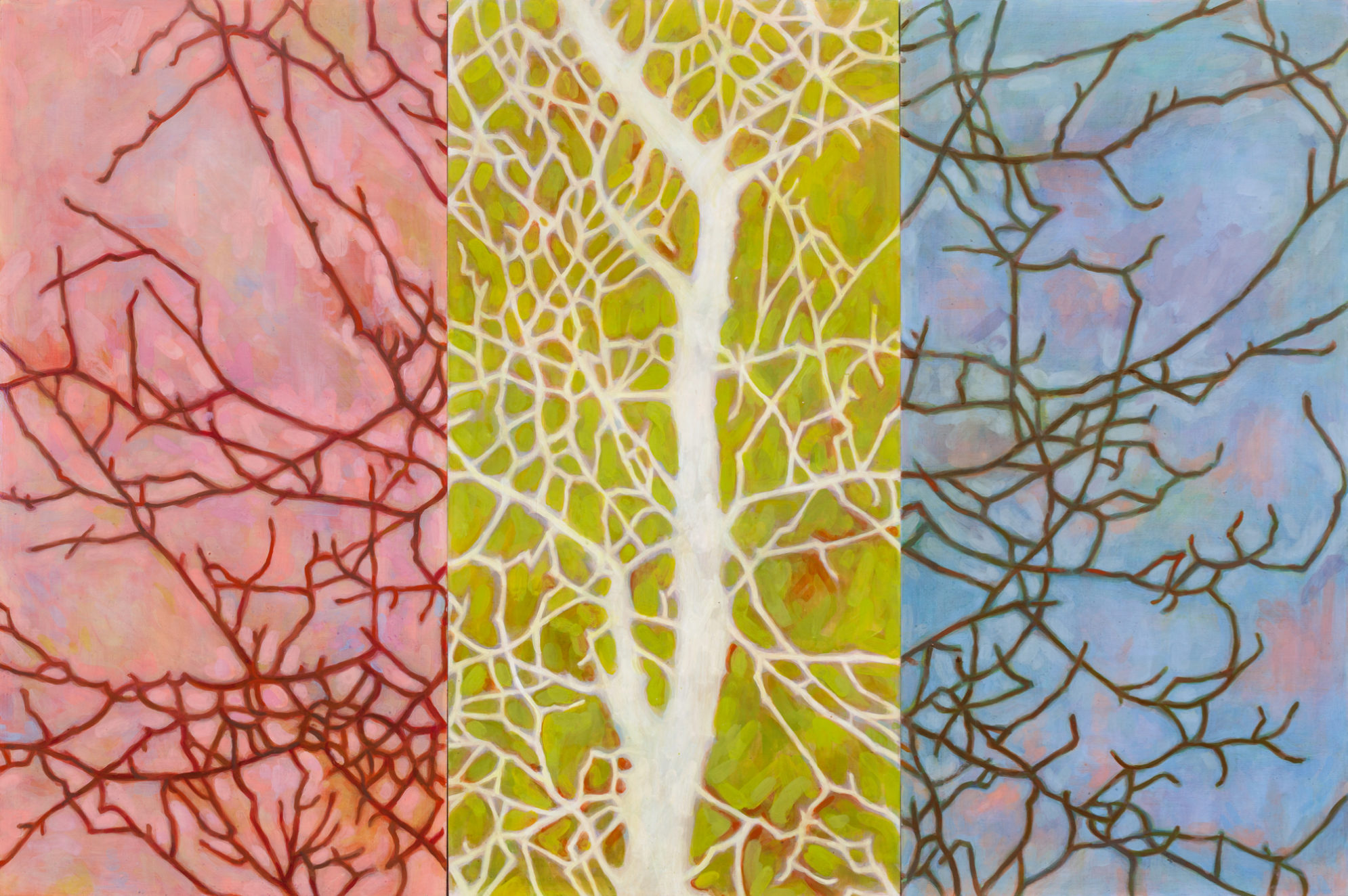 Prime Numbers: Technicolor Forest is rooted in tree forms and the intricate patterns they create when silhouetted against a solid color background. Using colors and divisions that highlight the discrepancy between the real world and the imagined world, they evoke an alternate universe. The title of the series refers to the number of panels making up the painting, neatly subdividing the world into orderly triptychs, recalling altar paintings and the exquisite order underlying life on earth.